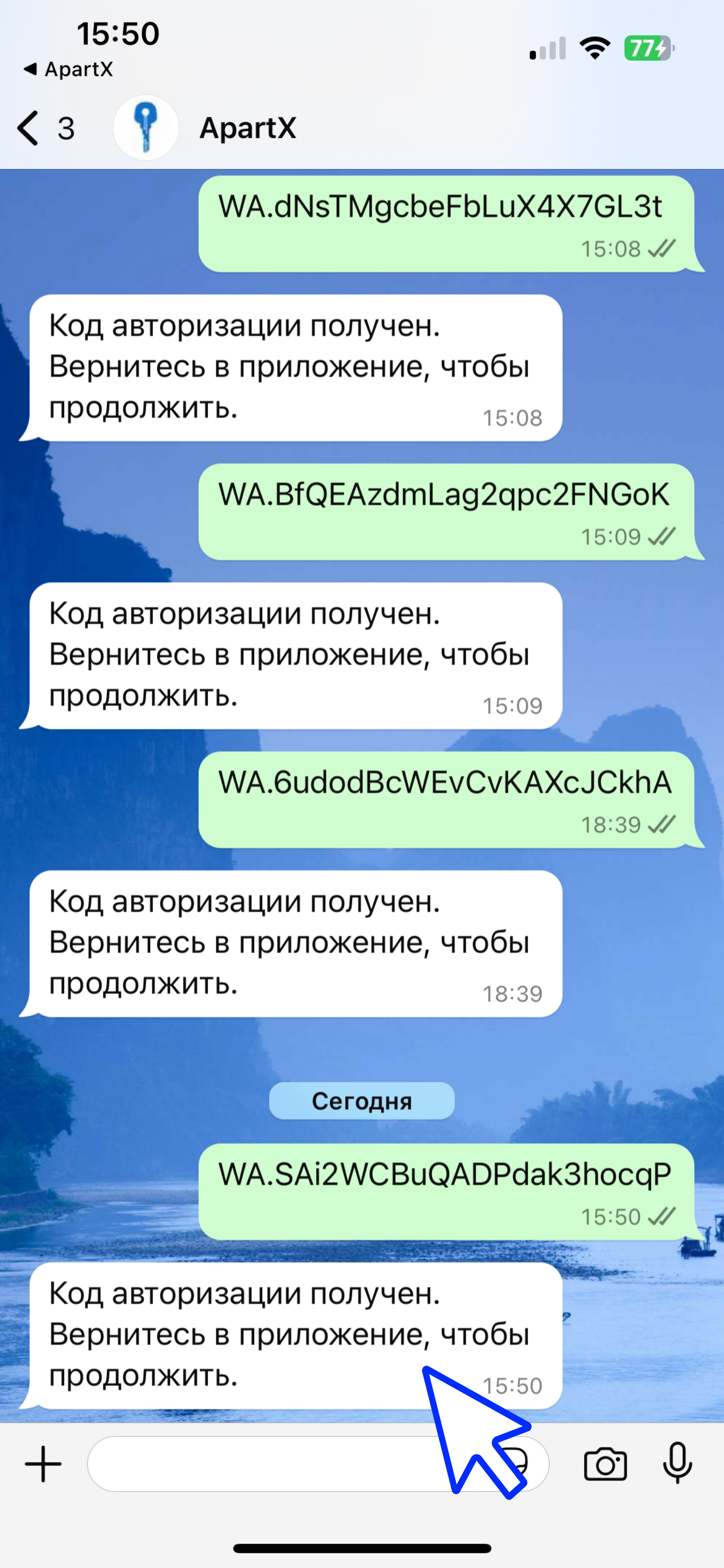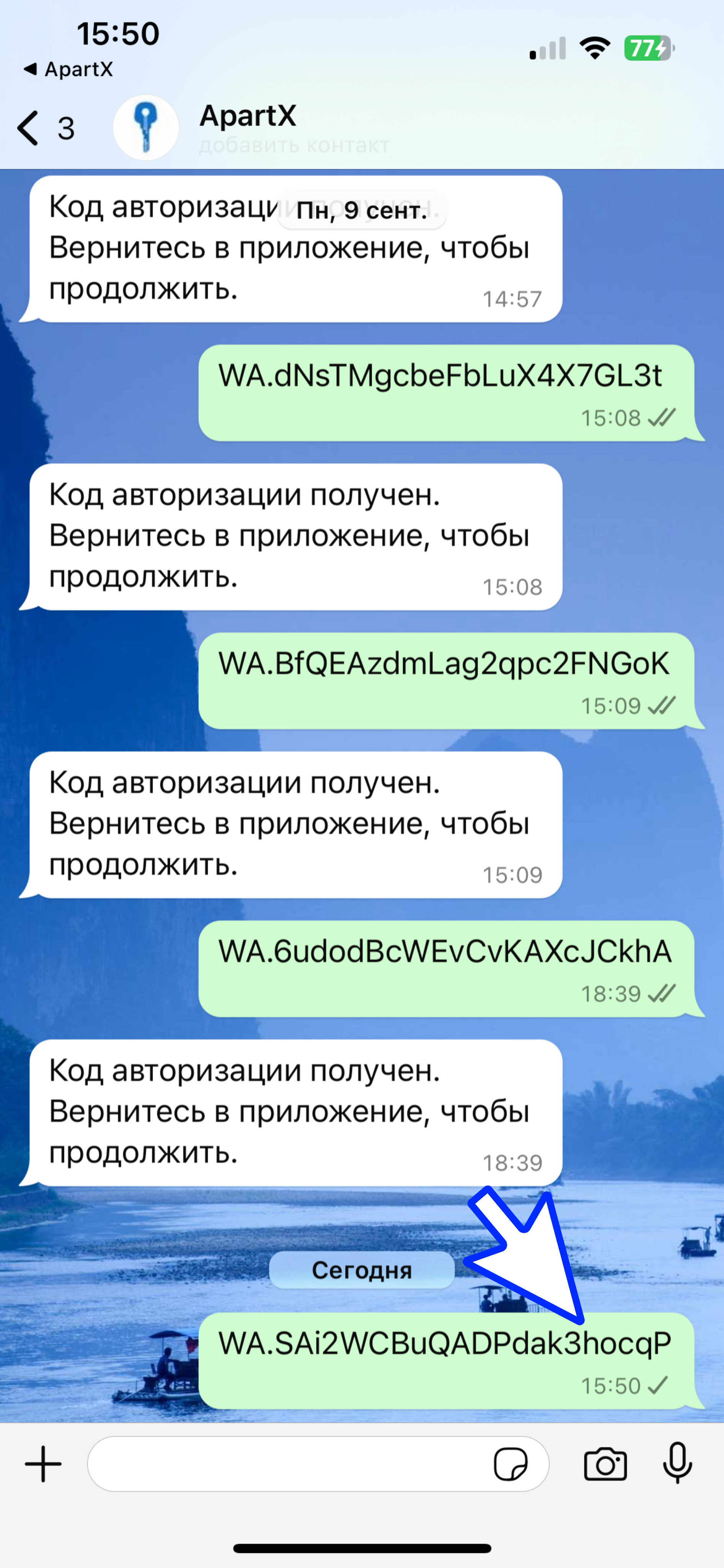 1. Войдите в приложение ApartX. Нажмите на кнопку "Войти через WhatsApp" (см. пример ниже)
