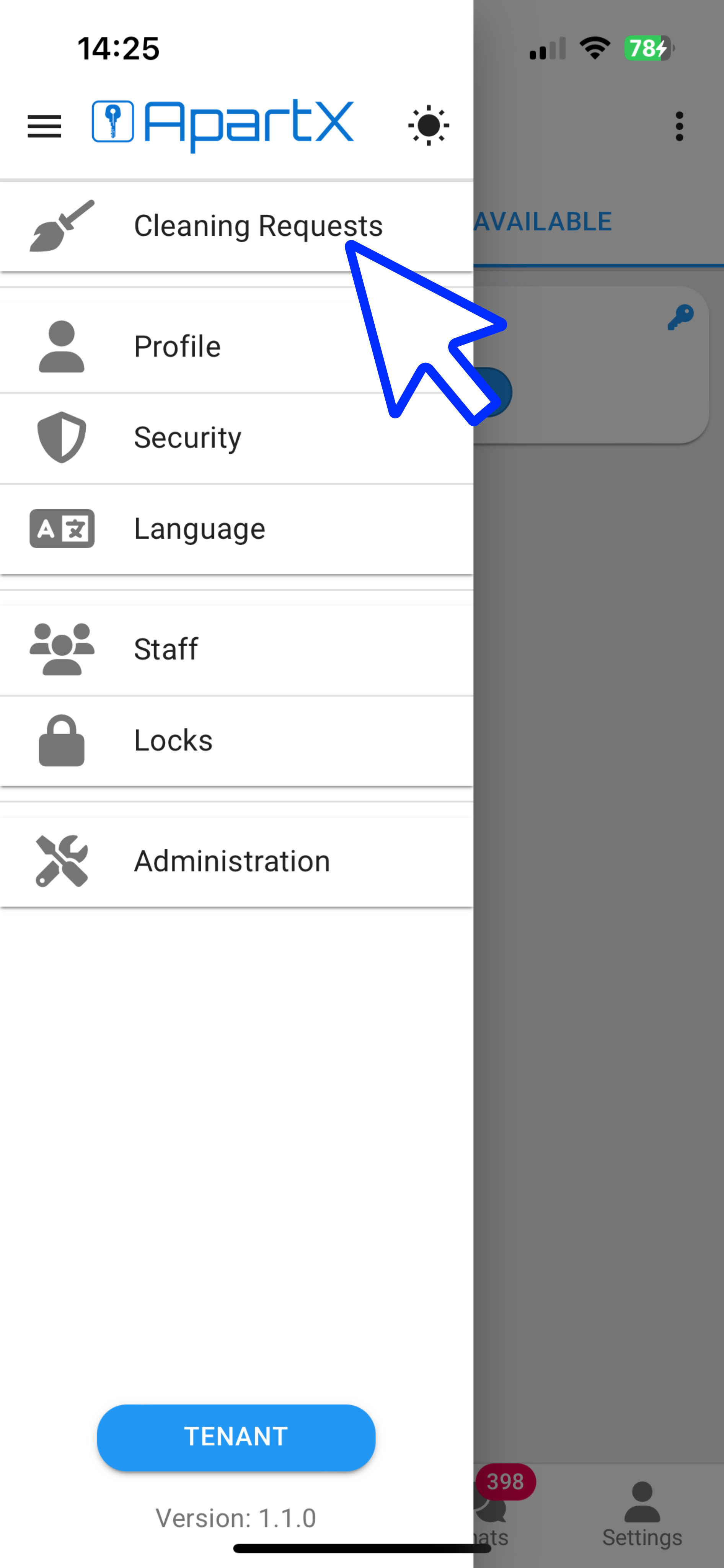 1. In the app, you can view all cleaning requests. To do this, go to the "Properties" section and click on the menu button in the upper left corner.